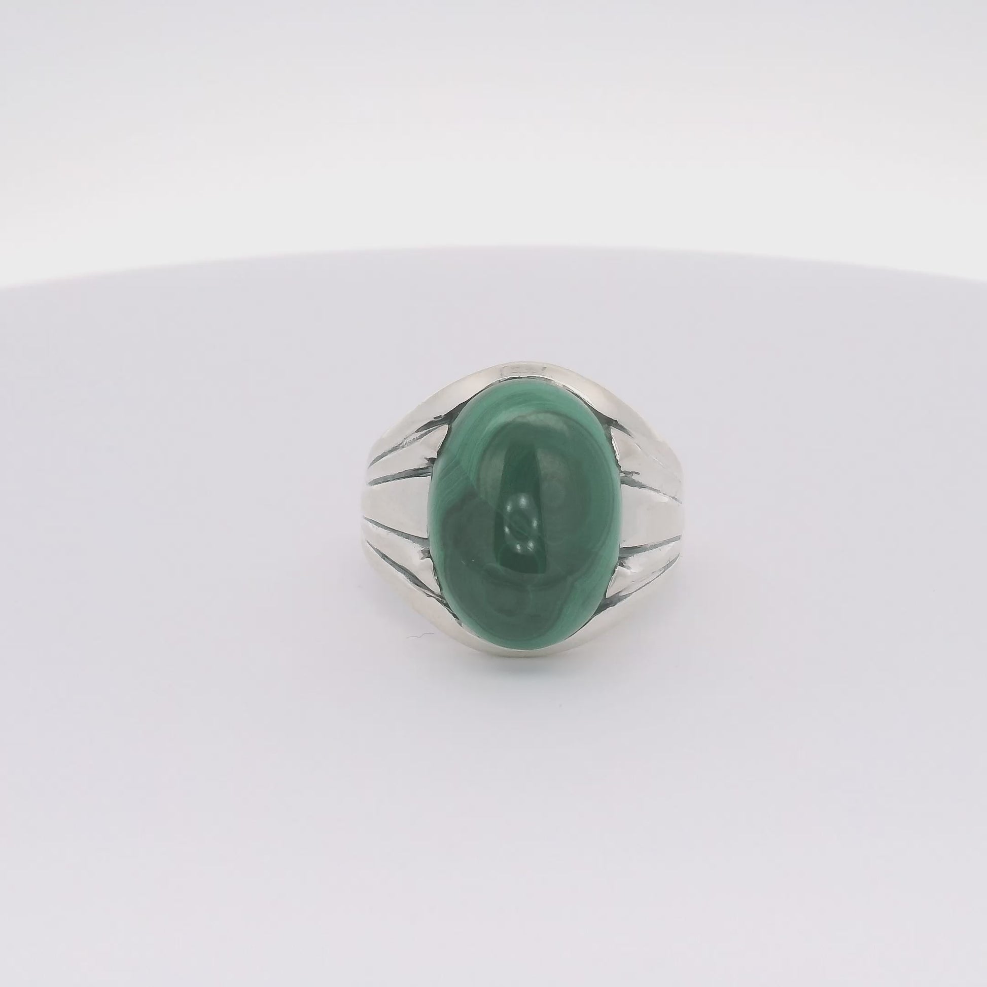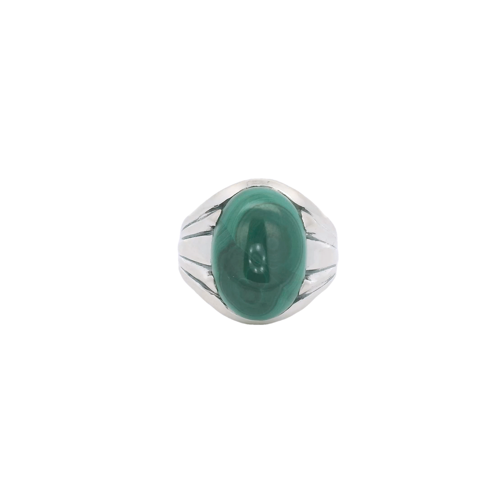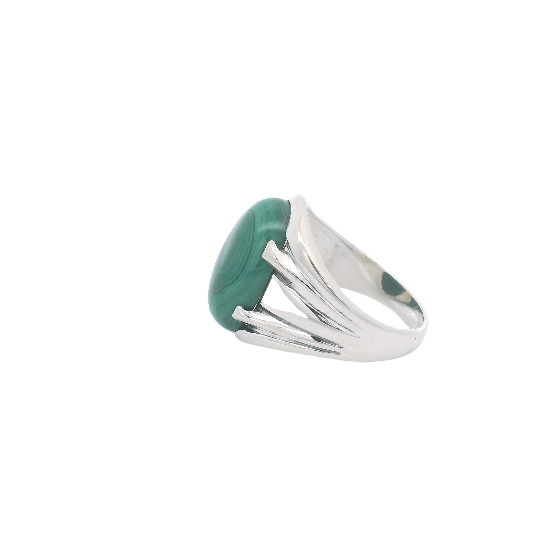 Exceptional style and quality come together in this Alftanes Malachite Ring. The high-polished shoulder design adds a touch of sophistication, while the natural malachite gemstone boasts stunning variations in color and pattern of rich green color tones. Get ready to make a statement with this unique and masculine ring. Order now and experience the beauty and individuality of organic gemstones.