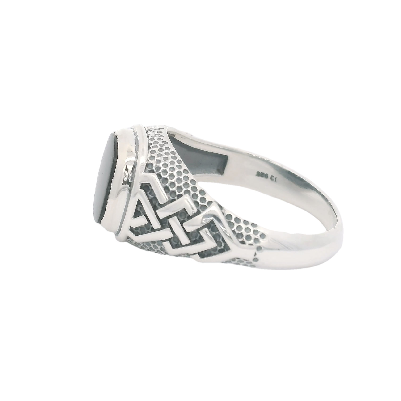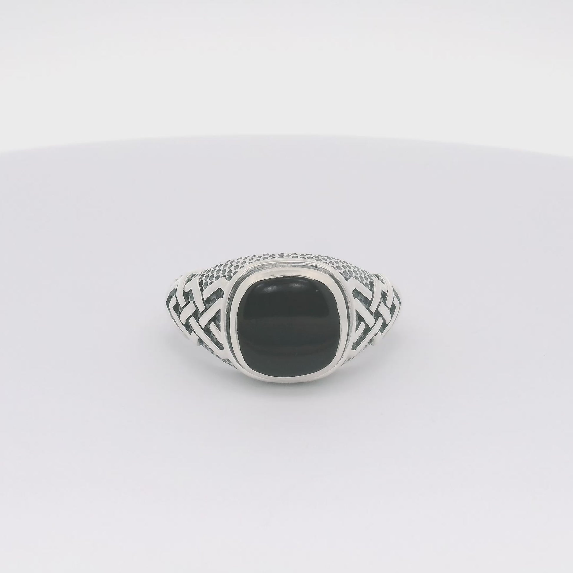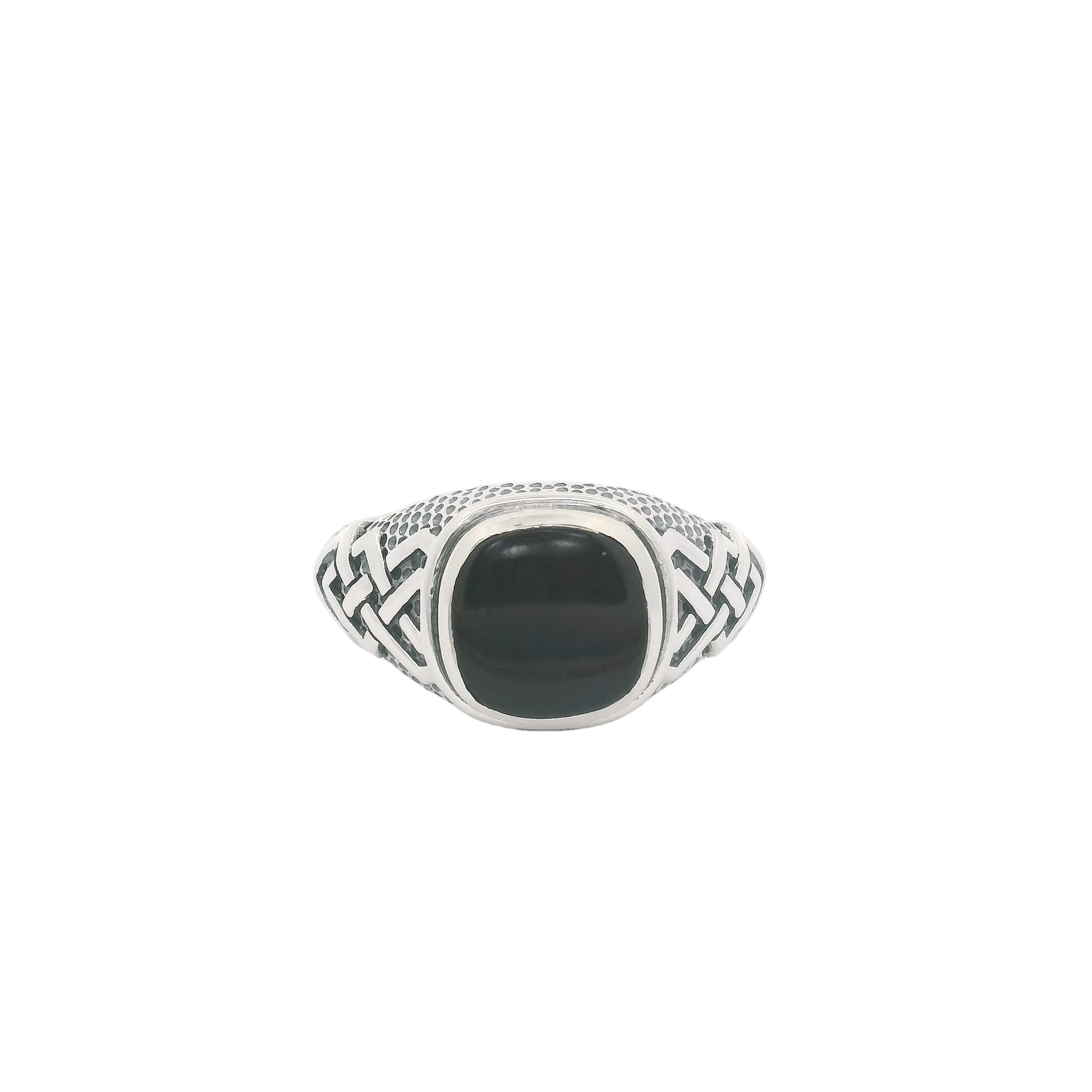 Crafted in sleek sterling silver, the Aisling Onyx ring features a bold black onyx gemstone inlay and intricate textured and geometric knot details. The tapered design makes for a comfortable fit, intended for wearing all the time. Made-to-order sizes are available, so you can customize the perfect fit for your finger.