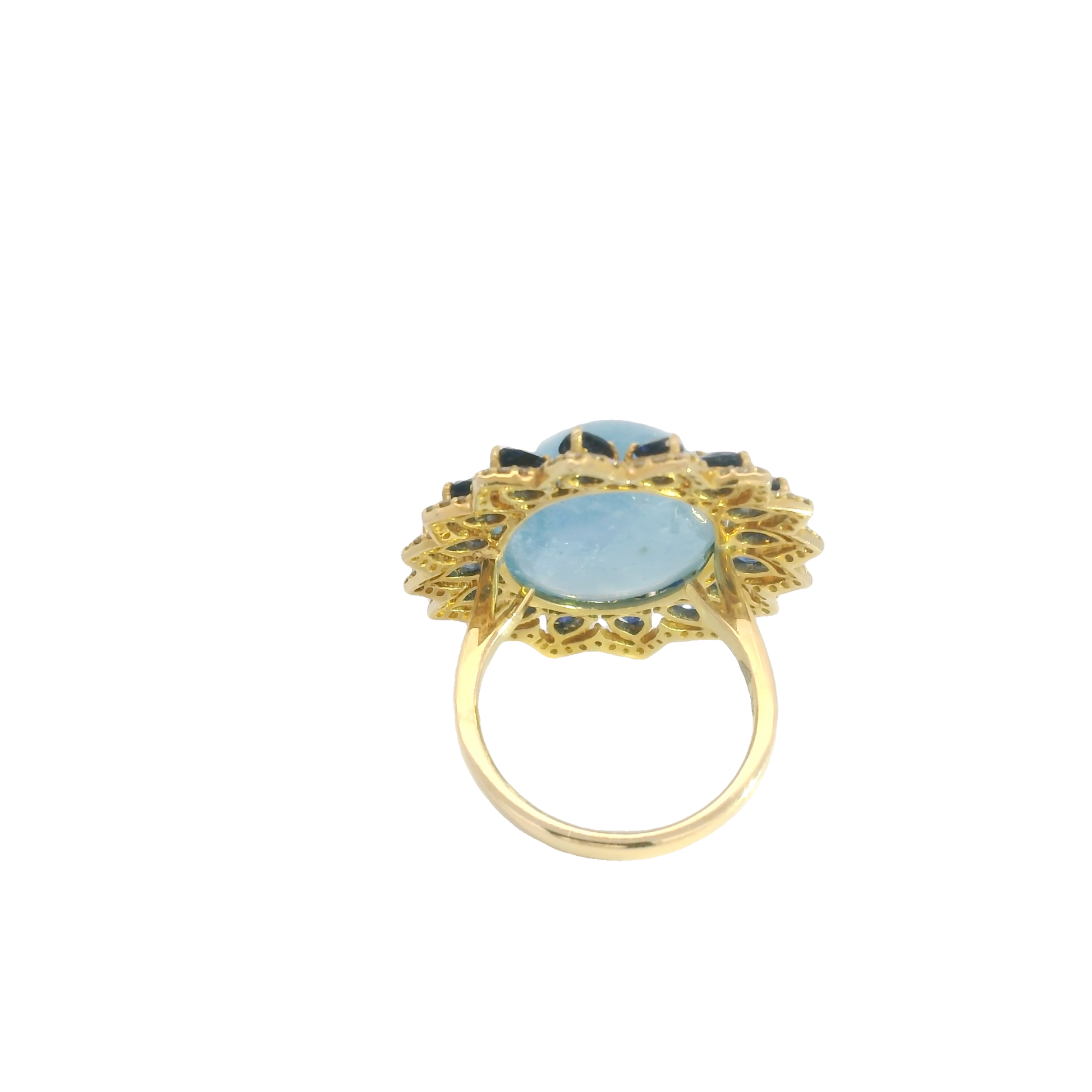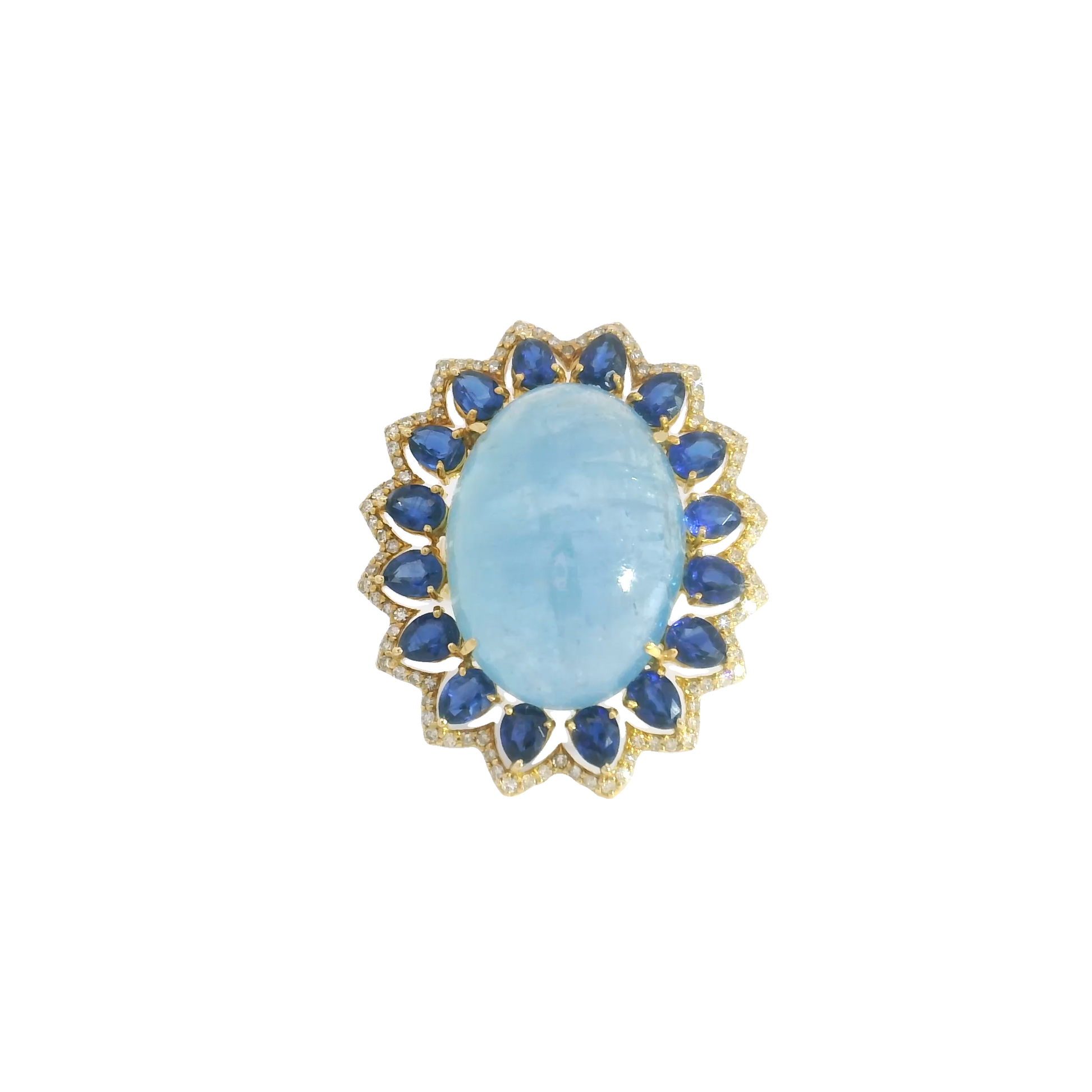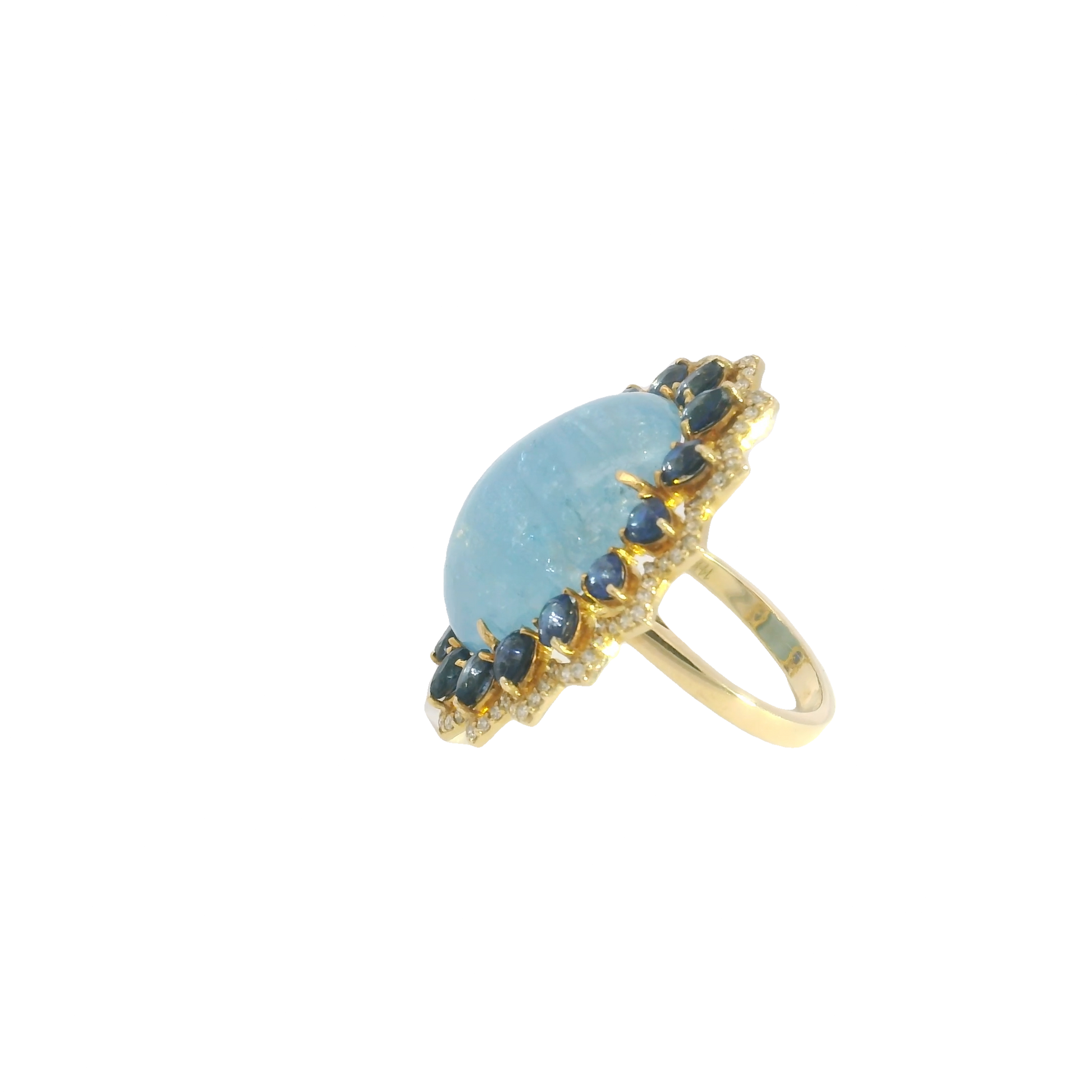 Serene and enchanting aquamarine and kyanite glow with incredible hues of blue in our Aquamarine Allura ring. As part of our One Of A Kind collection, this ring hits all the notes of an extra statement special piece you won't see yourself coming and going in. The substantial cabochon aquamarine is surrounded by a shapely halo of deep kyanite and brilliant white diamonds. Our OOAK Collection's Aquamarine Allura ring express the vast kinds of blue.