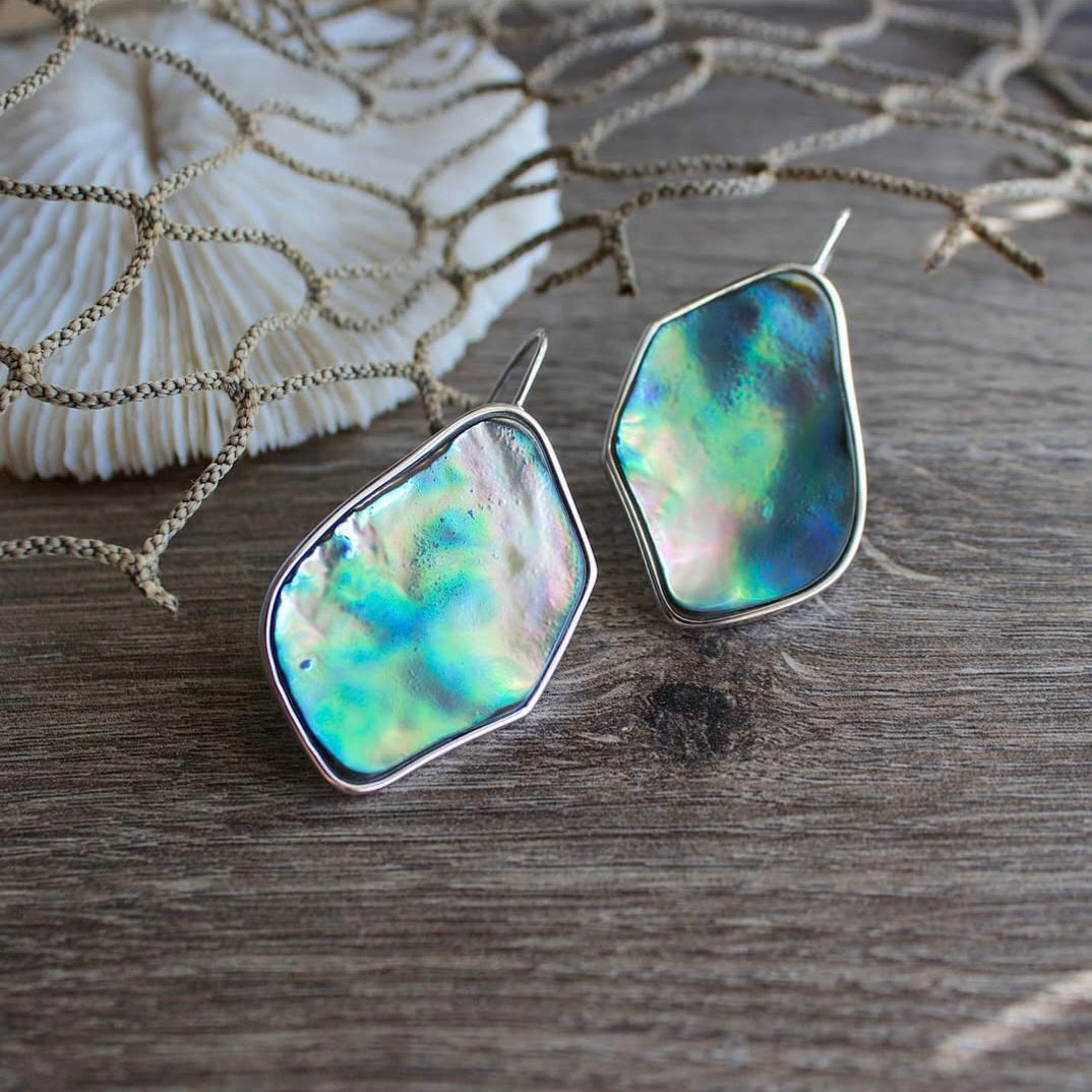 Can't get enough of the Clearwater Abalone Earrings, featuring shimmering turquoise, green, blue, and pink color tones... Each earring captures the beauty and depths of the water's surface, creating a bold and lightweight earring. Made with sterling silver, these earrings are the statement earring that will not only stand out, but also be taken out of your jewelry box and worn all the time.