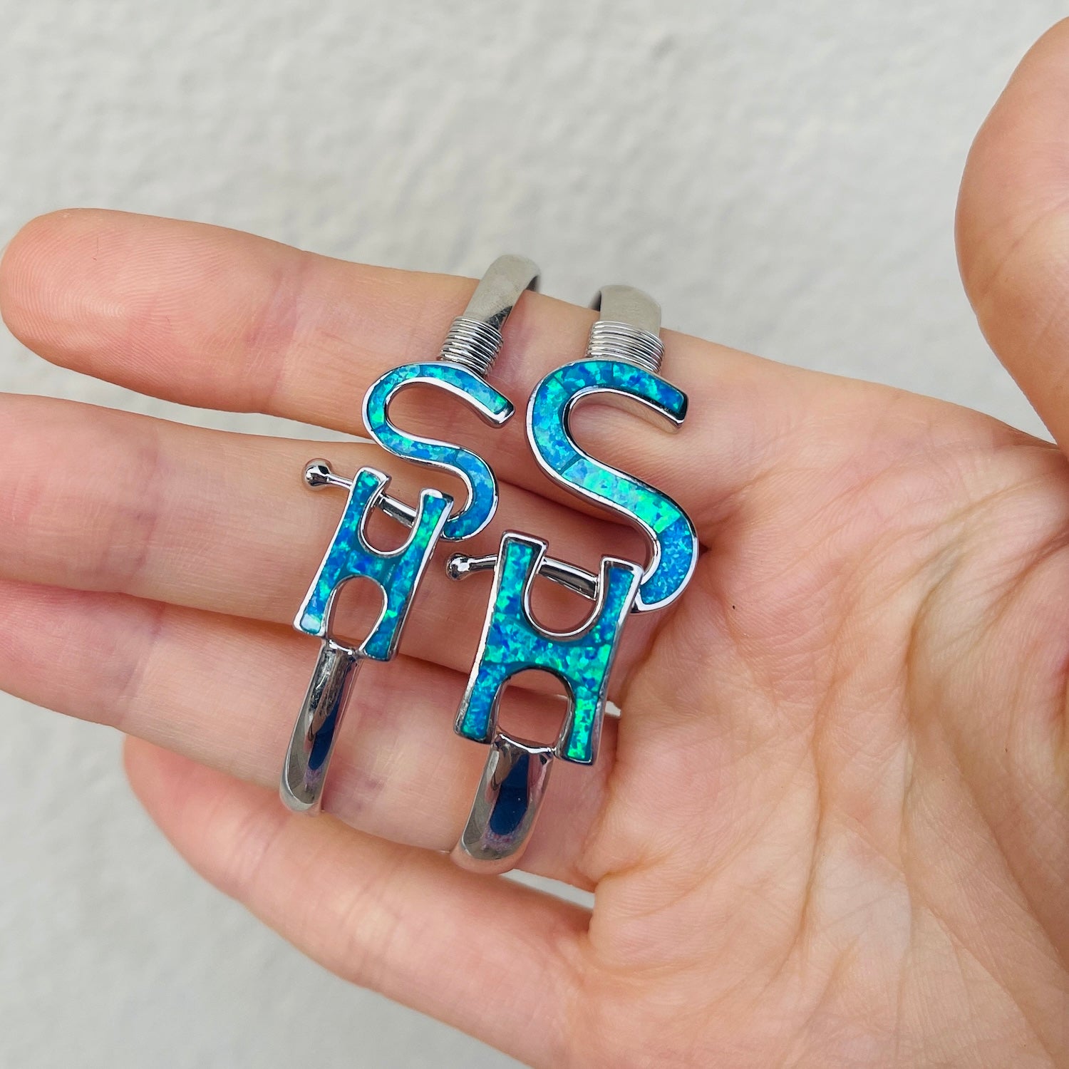 The Coastal Classic Ocean Opal Stone Harbor Bracelet is available in two scales-- our Classic (6mm width) and our Mini (4mm width), featuring solid sterling silver and a mosaic of ocean blue lab created opal inlay on a sterling silver band. Both scales of this design feature a hidden hook closure.