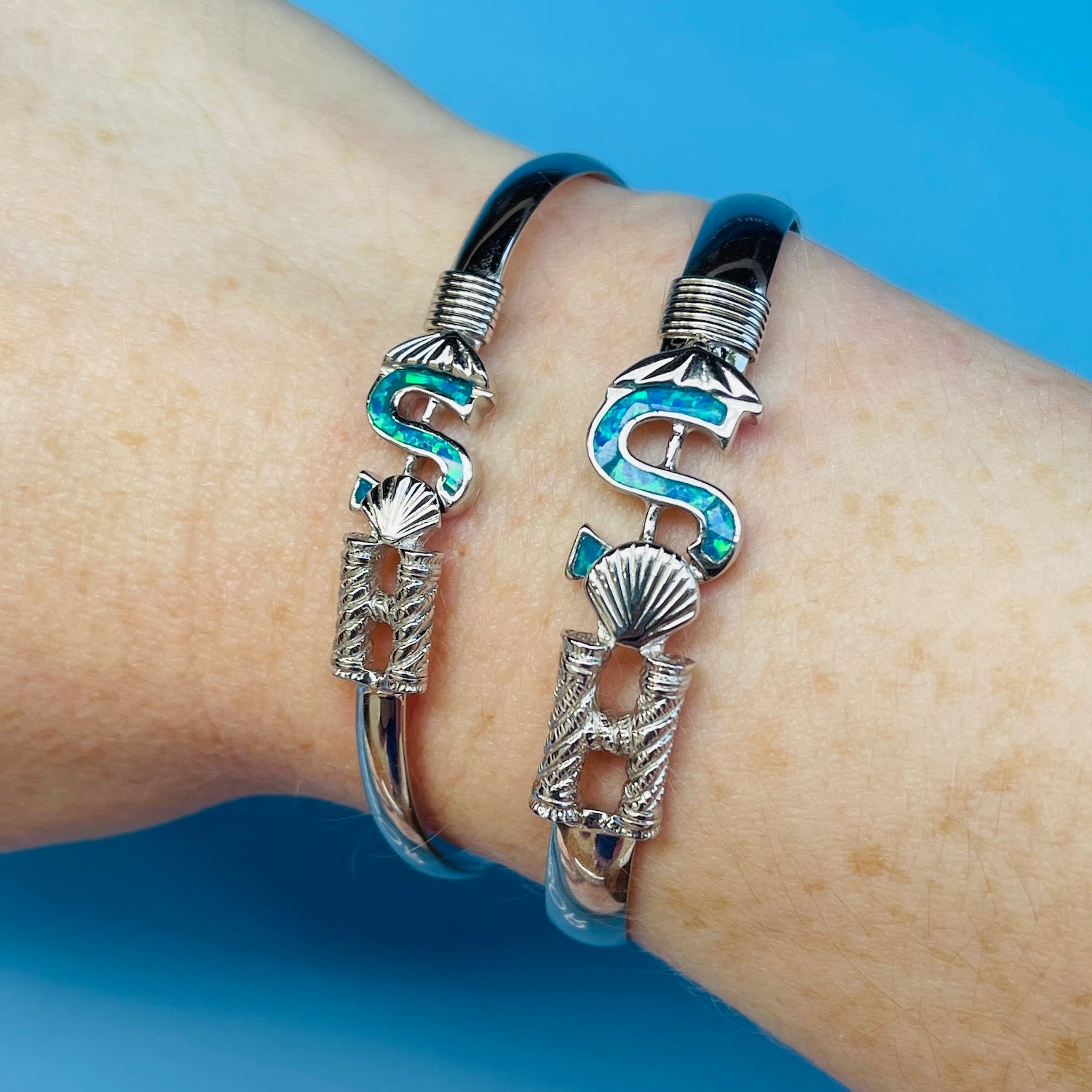 The Endless Summer Ocean Opal Stone Harbor Bracelet is available in our Classic (6mm width) and our Mini (4mm width), featuring solid sterling silver and a mosaic of ocean blue lab created opals on a sterling silver band. This design feature a hidden hook closure located under the seashell design.