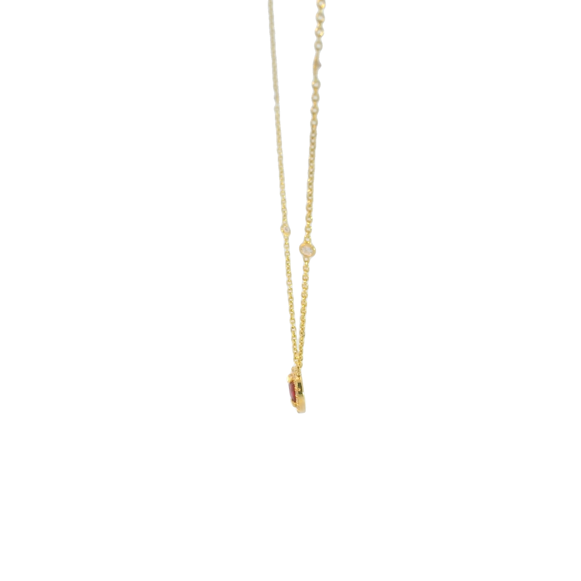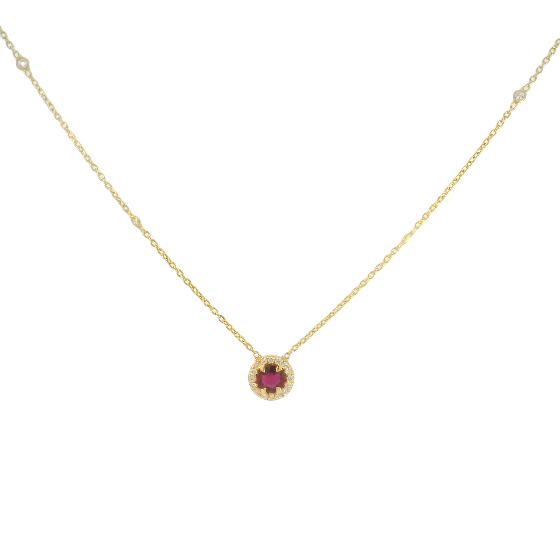- Ruby pendant with diamond halo on chain